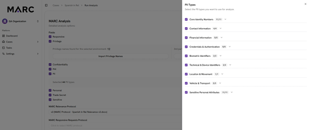 PII and PHI Detection: The system identifies personally identifiable information and protected health information with granular control over what types to flag. Users can specify, for example, that they only want to identify financial information and health information while ignoring personal email addresses or phone numbers. MARC performs entity analysis, associating information across a document even when, for instance, a person’s name appears on page two and their Social Security number on page seven.