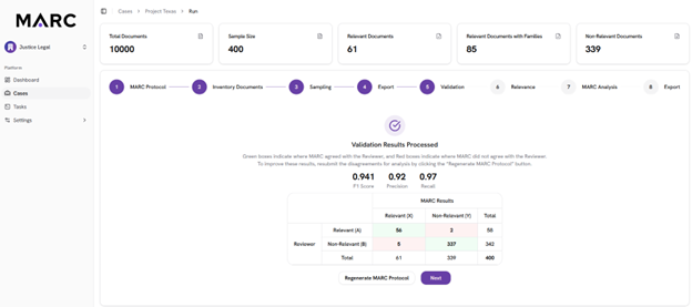 MARC’s results can be verified through a sampling and validation workflow. The system automatically determines the statistically valid sample size needed, analyzes those documents according to the protocol, and tags them as relevant or not relevant at a low per-document cost.