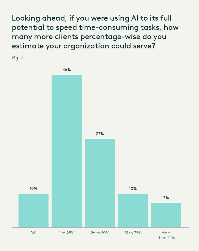 For these legal aid organizations struggling with overwhelming caseloads, perhaps one of the survey’s most compelling findings is that 90% of respondents said using AI to its full potential would enable them to serve more clients.